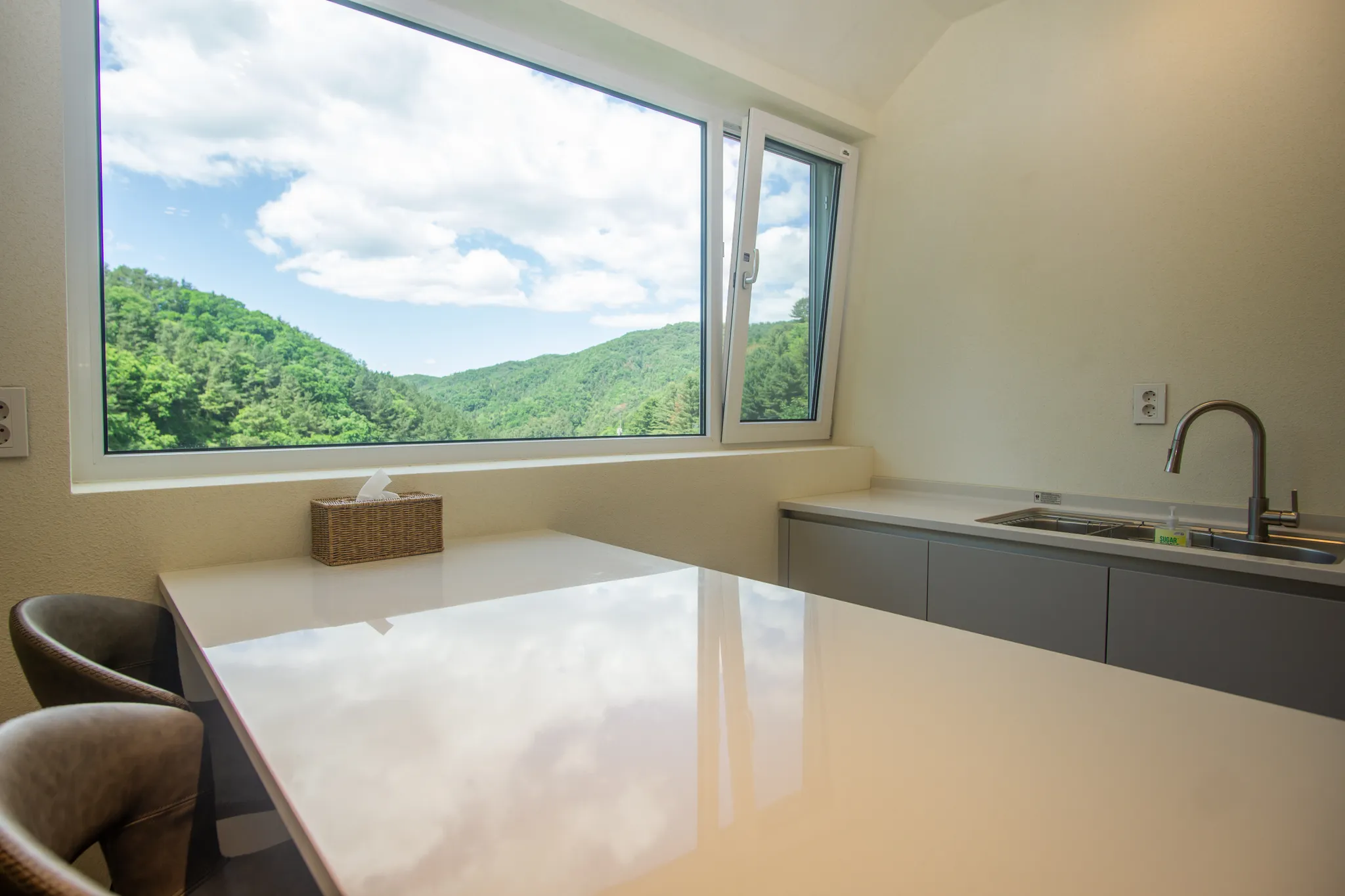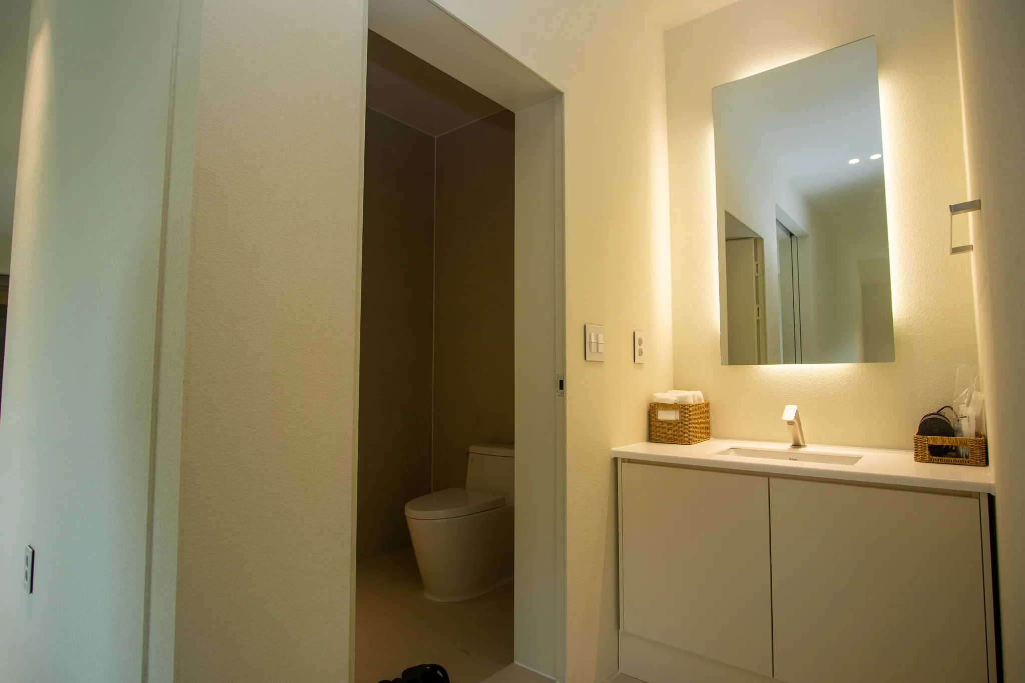 세면대 ( 화장대 ) 좌측이 화장실, 우측이 샤워실